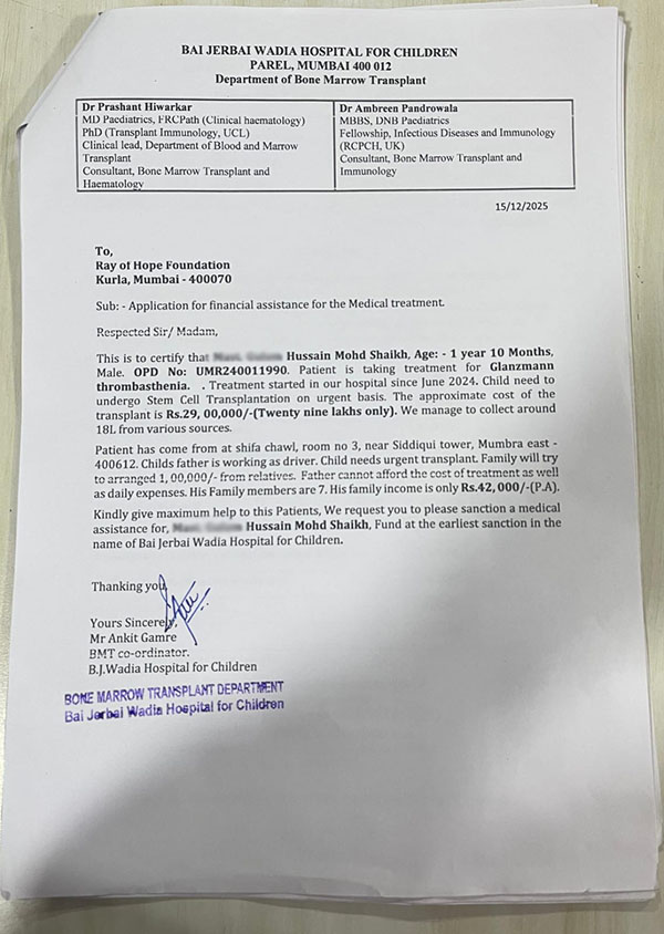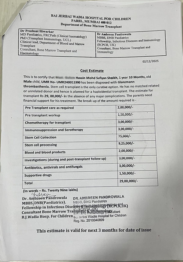 Baby of Ashiya, Age: - 1 year 10 Months, Male. OPD No: UMR240011990. Patient is taking treatment for Glanzmann thrombasthenia. Treatment started in our hospital since June 2024. Child need to undergo Stem Cell Transplantation on urgent basis. The approximate cost of the transplant is Rs.29,00,000/- (Twenty nine lakhs only). We manage to collect around 23L from various sources., We request you to please sanction a medical assistance for, Baby of Ashiya Treatment Taken under Dr. Ambreen Pandrowala.