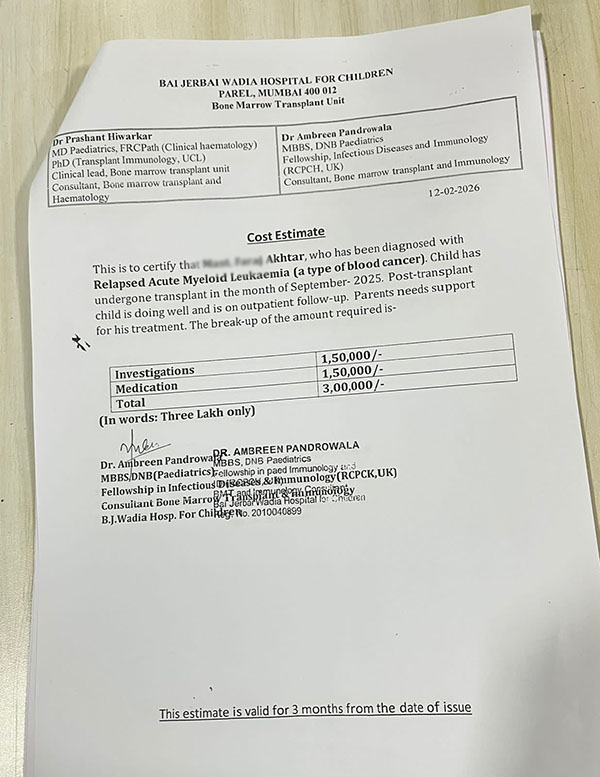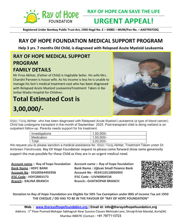 Mr Firoz Akhtar, (Father of Child) is Vegitable Seller. His wife Mrs. Chandni Parveen is house wife. As his income is less he is unable to manage his Son's medical treatment cost who has been diagnosed with Relapsed Acute Myeloid Leukaemia Treatment Taken in Bai Jerbai Wadia Hospital for Children.