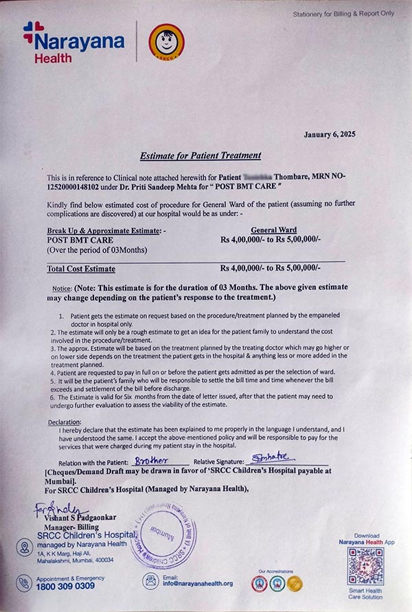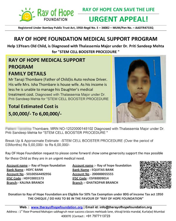 Daughter of Tanaji Thombre, MRN NO-12520000148102 Diagnosed with Thalassemia Major under Dr. Priti Sandeep Mehta for "STEM CELL BOOSTER PROCEDURE " Break Up & Approximate Estimate: -STEM CELL BOOSTER PROCEDURE (Over the period of 03Months) Rs 5,00,000/- to Rs 6,00,000/-
