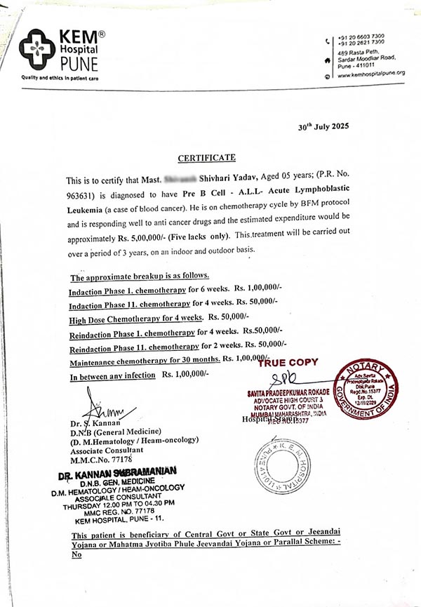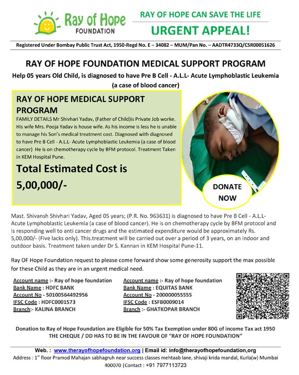 RAY OF HOPE MEDICAL SUPPORT PROGRAM Mr Shivhari Yadav, (Father of Child)is Private Job worke. His wife Mrs. Pooja Yadav is house wife. As his income is less he is unable to manage his Son’s medical treatment cost. Diagnosed with diagnosed to have Pre B Cell - A.L.L- Acute Lymphoblastic Leukemia (a case of blood cancer) He is on chemotherapy cycle by BFM protocol. Treatment Taken in KEM Hospital Pune.