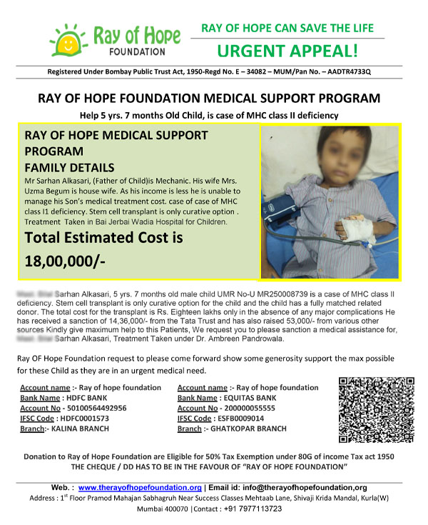 Mr Sarhan Alkasari, (Father of Child)is Mechanic. His wife Mrs. Uzma Begum is house wife. As his income is less he is unable to manage his Son's medical treatment cost. case of case of MHC class 11 deficiency. Stem cell transplant is only curative option. Treatment Taken in Bai Jerbal Wadia Hospital for Children.
