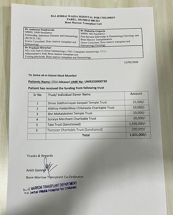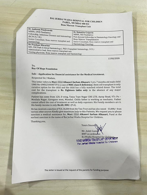 Son of Uzma, 5 yrs. 7 months old male child UMR No-U MR250008739 is a case of MHC class II deficiency. Stem cell transplant is only curative option for the child and the child has a fully matched related donor. The total cost for the transplant is Rs. Eighteen lakhs only in the absence of any major complications He has received a sanction of 14,36,000/- from the Tata Trust and has also raised 53,000/- from various other sources Kindly give maximum help to this Patients, We request you to please sanction a medical assistance for, Son of Uzma, Treatment Taken under Dr. Ambreen Pandrowala.